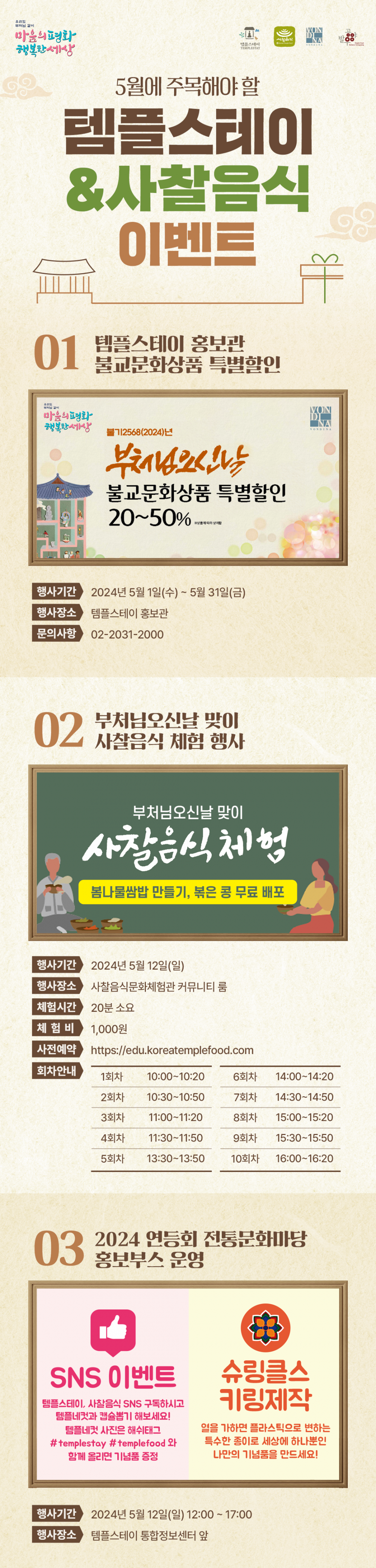부처님오신날을 맞이해서 템플스테이와 사찰음식에서 많은 이벤트를 진행합니다.